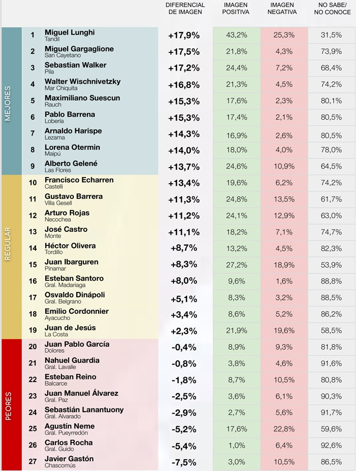 El ranking destaca a dirigentes con un alto diferencial positivo en imagen pública. Entre ellos, además de Gelené, se encuentran Miguel Lunghi (Tandil), Miguel Gargaglione (San Cayetano), Sebastán Walker (Pila), Walter Wischnivetzky (Mar Chiquita), Maximiliano Suescun (Rauch), Pablo Barrena (Lobería), Arnaldo Harispe (Lezama) y Lorena Otermmin (Maipú).
