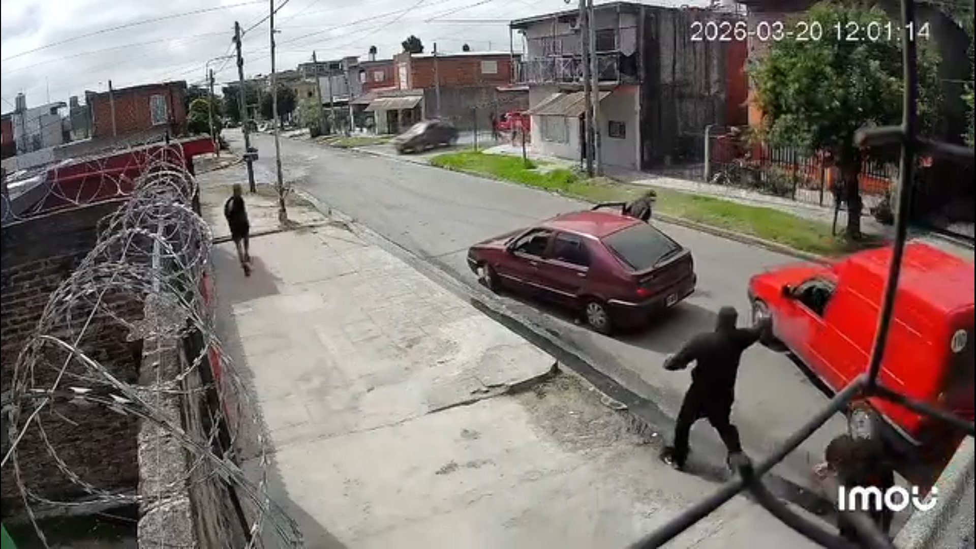 La filmación muestra a un hombre esperando en la vereda para ser atendido en un comercio, mientras otro individuo permanece dentro de una camioneta Fiorino roja. De repente, dos sujetos caminan hacia el utilitario y un automóvil trata de interceptar la camioneta para bloquear su paso.