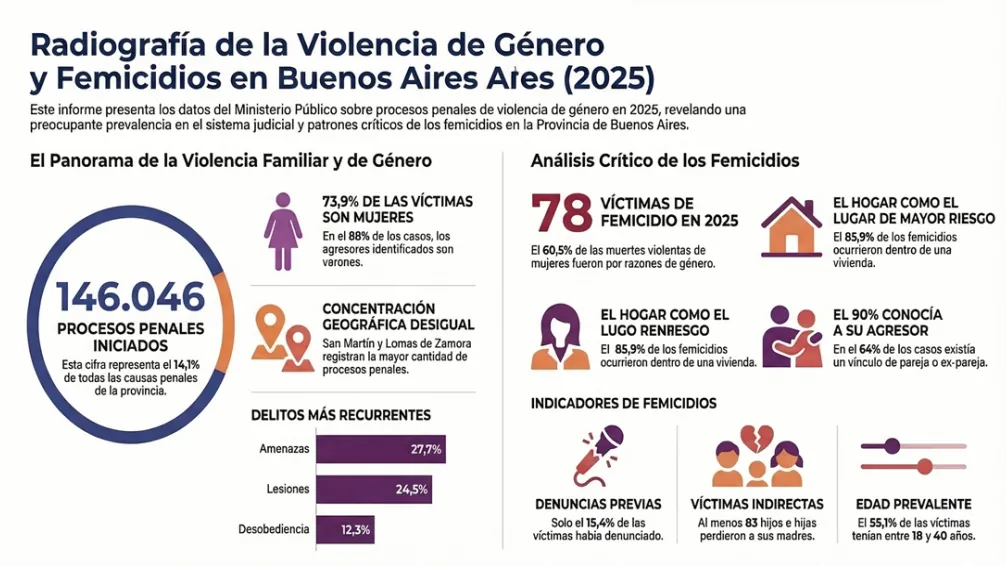 El Ministerio Público de la provincia de Buenos Aires dio a conocer un informe que muestra que durante el año 2025 se iniciaron 74 procesos penales relacionados con femicidios, con un total de 78 víctimas fatales, incluyendo una mujer trans/travesti. Estos datos provienen del Informe de Femicidios y Procesos Penales de Violencia Familiar y de Género, basado en la información del Registro Penal de Violencia Familiar y de Género (REVIFAG).