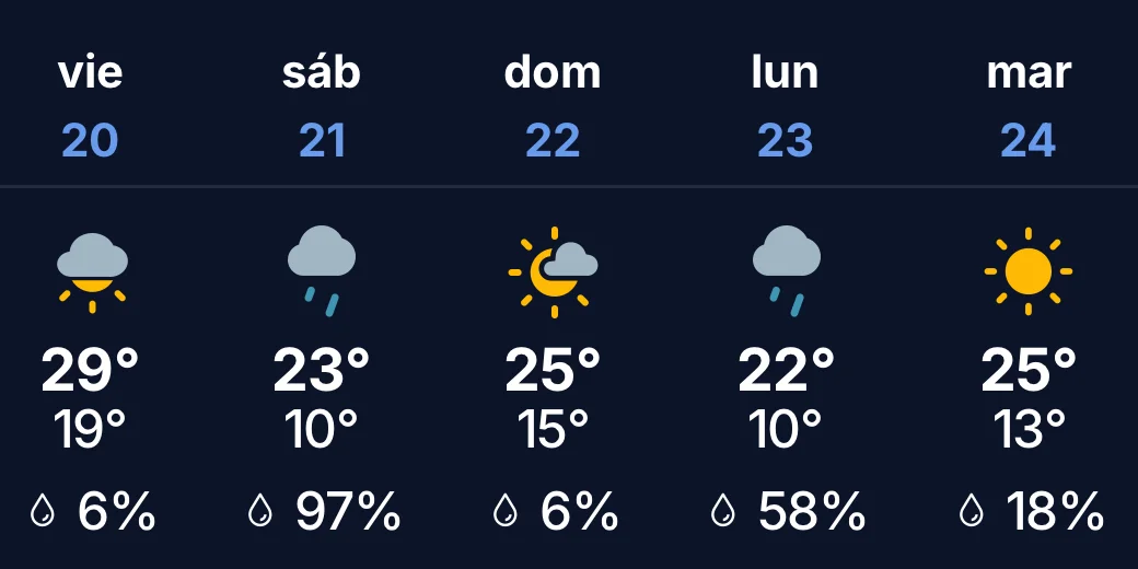 El viernes iniciará mayormente nublado, con cúmulos bajos y densos que favorecerán algunas lloviznas aisladas. Por la mañana, la zona tendrá un amanecer cubierto y viento leve del noreste, con una temperatura mínima de 19ºC.